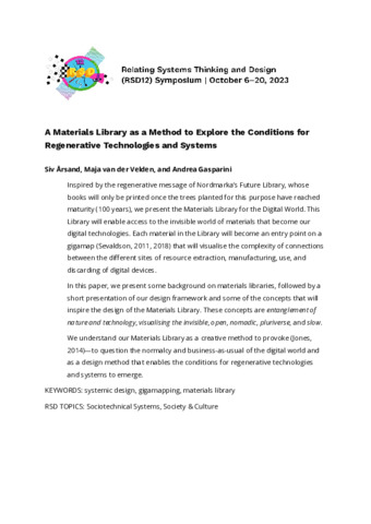 Årsand, Siv, Van der Velden, Maja and Gasparini, Andrea (2023) A Materials Library as a Method to Explore the Conditions for Regenerative Technologies and Systems. In: Proceedings of Relating Systems Thinking and Design Volume: RSD12, 06-20 Oct 2023.