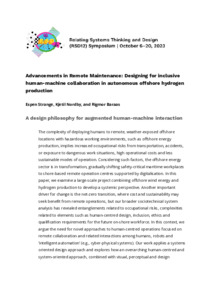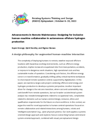 Strange, Espen, Nordby, Kjetil and Baraas, Rigmor (2023) Advancements in Remote Maintenance: Designing for inclusive human-machine collaboration in autonomous offshore hydrogen production. In: Proceedings of Relating Systems Thinking and Design Volume: RSD12, 06-20 Oct 2023.