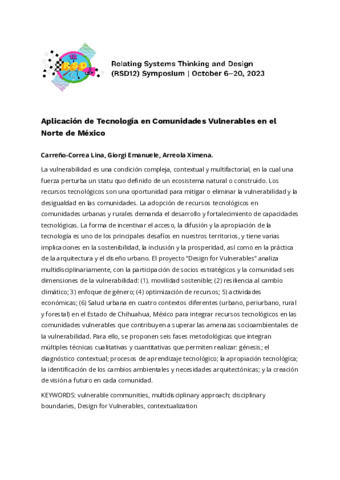Lina, Carreño-Correa, Emanuele, Giorgi and Ximena, Arreola (2023) Aplicación de Tecnología en Comunidades Vulnerables en el Norte de México. In: Proceedings of Relating Systems Thinking and Design Volume: RSD12, 06-20 Oct 2023.