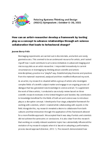 Berry-Frith, Joanne (2023) Art-Science Collaboration Framework: Play as a concept. In: Proceedings of Relating Systems Thinking and Design Volume: RSD12, 06-20 Oct 2023.