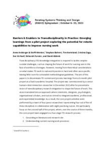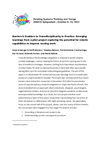Arzberger, Anne, Menten, Steffi, Balvert, Stephan, Korteland, Tim, Zaga, Cristina, Verhoef, Eva, Forster, Deborah and Abbink, David (2023) Barriers and Enablers to Transciplinarity in Practice. In: Proceedings of Relating Systems Thinking and Design Volume: RSD12, 06-20 Oct 2023.
