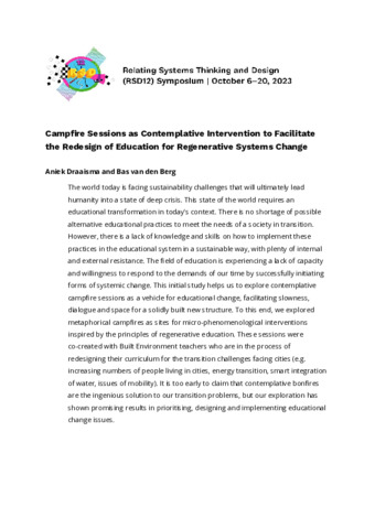 Draaisma, Aniek and van den Berg, Bas (2023) Campfire Sessions as Contemplative Intervention to Facilitate the Redesign of Education for Regenerative Systems Change. In: Campfire Sessions as Contemplative Intervention to Facilitate the Redesign of Education for Regenerative Systems Change Published in: Proceedings of Relating Systems Thinking and Design, 06-20 Oct 2023.