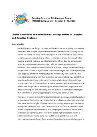 Schmidt, Ruth (2023) Choice Conditions and Behavioural Leverage Points in Complex and Adaptive Systems. In: Proceedings of Relating Systems Thinking and Design Volume: RSD12, 06-20 Oct 2023.