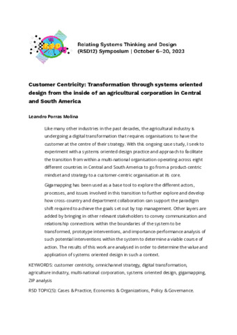 Porras Molina, Leandro (2023) Customer Centricity: Transformation through systems oriented design from the inside of an agricultural corporation in Central and South America. In: Proceedings of Relating Systems Thinking and Design Volume: RSD12, 06-20 Oct 2023.