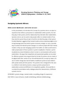 In this presentation, we introduce the concept of a systemic mirror: an object or experience that reflects a perspective on stakeholders within systems, the role they play in that system, and the relationship they hold with other stakeholders. Systemic mirrors can be used to help people reflect on mental models of how they view the system they are part of and the role that they play in that system. Donella Meadows suggested that mental models and associated paradigms are a strong leverage point from which system structures emerge. As such, a possible way to achieve the desired system change is to confront people with their mental models so they can start changing systems from within. An often-used format to make people aware of those systems is system visualisation. However, system visualisations present limitations when it comes to communication with system stakeholders. We argue that empathetic and experiential qualities are essential for effective systemic mirroring and that the format of systemic mirrors needs to be aligned with their context of use. We will illustrate this concept by means of a case in which change was desired within a healthcare system around children with special needs and their parents. The systemic mirror designed for this case is a children’s book which presents a unique systemic perspective to stakeholders and proved effective in its empathetic qualities. We would like to conclude the presentation with a dialogue about the characteristics of effective systemic mirrors.