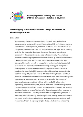 Mikus, Jenna (2023) Disentangling Eudaemonia-focused Design as a Means of Flourishing Curation. In: Proceedings of Relating Systems Thinking and Design Volume: RSD12, 06-20 Oct 2023.