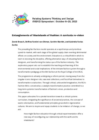 Broach, Zowie, Fantini van Ditmar, Delfina, Bartlet, Savithri and Farias Zurita, Gabriela (2023) Entanglements of Wastelands of Fashion: A curricula re-vision. In: Proceedings of Relating Systems Thinking and Design Volume: RSD12, 06-20 Oct 2023.