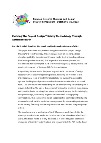 Bell, Gary, Dunckley, Isabel, Lovell, Kat and Calderon Tellez, Javier Andres (2023) Evolving the Project Design Thinking Methodology Through Action Research. In: Proceedings of Relating Systems Thinking and Design Volume: RSD12, 06-20 Oct 2023.