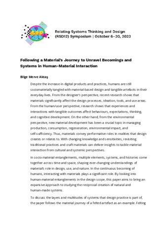 Aktaş, Bilge Merve (2023) Following a Material’s Journey to Unravel Becomings and Systems in Human-Material Interaction. In: Proceedings of Relating Systems Thinking and Design Volume: RSD12, 06-20 Oct 2023.