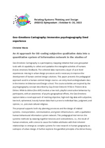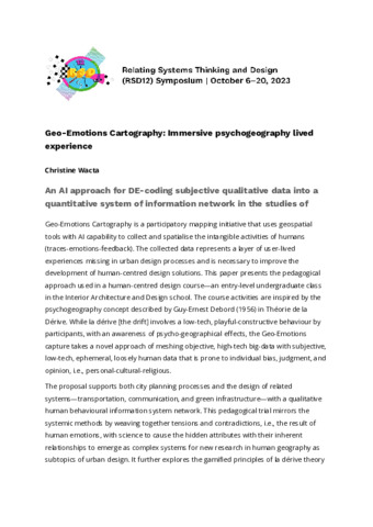 Wacta, Christine (2023) Geo-Emotions Cartography: Immersive psychogeography lived experience. In: Proceedings of Relating Systems Thinking and Design Volume: RSD12, 06-20 Oct 2023.