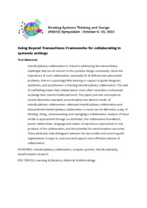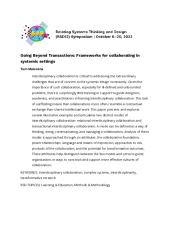Maiorana, Thomas (2023) Going Beyond Transactions: Frameworks for collaborating in systemic settings. In: Proceedings of Relating Systems Thinking and Design Volume: RSD12, 06-20 Oct 2023.