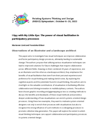 Lind, Marianne and Gläser, Franziska (2023) I Spy with My Little Eye: The power of visual facilitation in participatory processes. In: Proceedings of Relating Systems Thinking and Design Volume: RSD12, 06-20 Oct 2023.