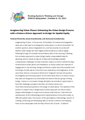 Efremenko, Tatiana, Grzesikowska, Gosia and Grzesikowska, Honorata (2023) Imagineering Urban Places: Enhancing the urban design process with a futures-driven approach to design for spatial equity. In: Proceedings of Relating Systems Thinking and Design Volume: RSD12, 06-20 Oct 2023.
