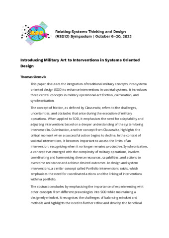 Slensvik, Thomas (2023) Introducing Military Art to Interventions in Systems Oriented Design. In: Proceedings of Relating Systems Thinking and Design Volume: RSD12, 06-20 Oct 2023.