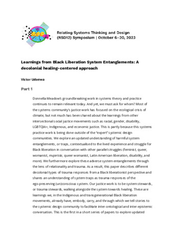 Udoewa, Victor (2023) Learnings from Black Liberation System Entanglements: A decolonial healing-centered approach. In: Proceedings of Relating Systems Thinking and Design Volume: RSD12, 06-20 Oct 2023.