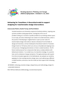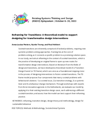 Peeters, Anna-Louisa, Tromp, Nynke and Hekkert, Paul (2023) Reframing for Transitions: A theoretical model to support designing for transformative design interventions. In: Proceedings of Relating Systems Thinking and Design Volume: RSD12, 06-20 Oct 2023.