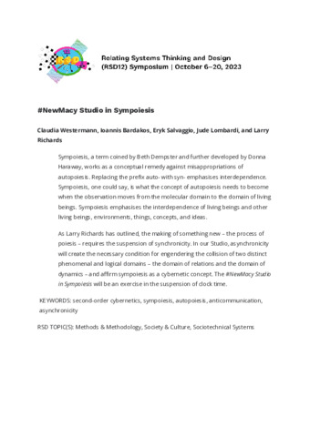 Westermann, Claudia, Bardakos, Ioannis, Salvaggio, Eryk, Lombardi, Jude and Richards, Larry (2023) #NewMacy Studio in Sympoiesis. In: Proceedings of Relating Systems Thinking and Design Volume: RSD12, 06-20 Oct 2023, Pittsburgh, USA.