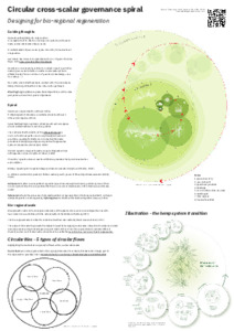 For operationalising design for regeneration, we need to take decisions across scales of governance and space and adopt practices of continuously zooming in on details and then zooming out to see the bigger picture, which are processes in dynamic relation. The poster offers a spiral approach to relating circularities on eight nested spatial and governance scales, from green chemistry to transnational cooperation (Luthe, Fitzpatrick & Wahl, 2020). Planning and design decisions on one scale have a direct or indirect impact on all scales; thus, governance must better evaluate cross-scalar systemic effects. This conceptual framework is partly based on Wahl (2006) and is here presented in the form of a novel contribution to designing resilient regenerative systems. The mathematical foundation is the Fibonacci spiral: a common functional pattern occurring throughout nature, it provides an analogy for better communicating the scalar processes of designing and governing resilient regenerative systems (Drozdyuk and Drozdyuk, 2010; Bistagnino, 2018).