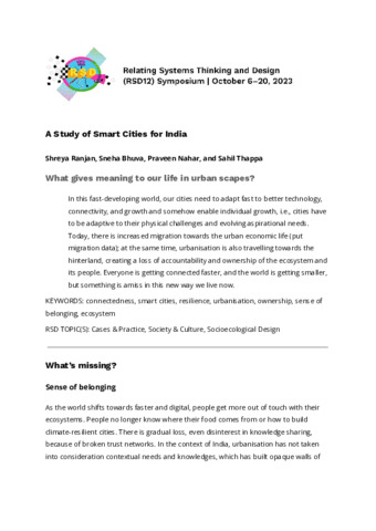 Ranjan, Shreya, Bhuva, Sneha, Nahar, Praveen and Thappa, Sahil (2024) A Study of Smart Cities for India. In: Proceedings of Relating Systems Thinking and Design Volume: RSD12, 26 Feb - 06 May 2024.