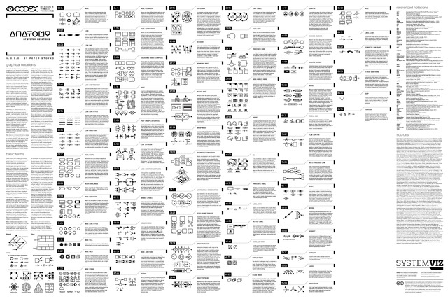 System graphical notations are standardised shorthands for diagramming systems. Most take the form of node-and-link diagrams (hypergraphs), stacks, and spatial-map encodings. These graphical notations remain in widespread use but have not evolved significantly over the last thirty years. That plateauing is conspicuous given the many advancements in other forms of system visualisation and systems thinking in general. The Pattern Atlas of System Vulnerabilities was presented at RSD11. That work included a poster itemising 30 forms of problematic system entanglement. The new exhibit presents subsequent work that attempts to visually disentangle complex interactions within and between systems. A poster itemises and illustrates the various graphical devices used in system graphical notations. In a sense, this would be an anatomy chart of system notations in all their diversity. The poster identifies which forms work better, which are dysfunctional, and which are innovations that have been under-used (or otherwise neglected). Those insights provide a stepping stone to the creation of updated notations, ideally, ones better suited to our era in which multi-media maps are overtaking static ones. Those insights would also suggest good practices for those who integrate system notations into other forms of graphics, such as infographics, gigamaps, and synthesis maps.