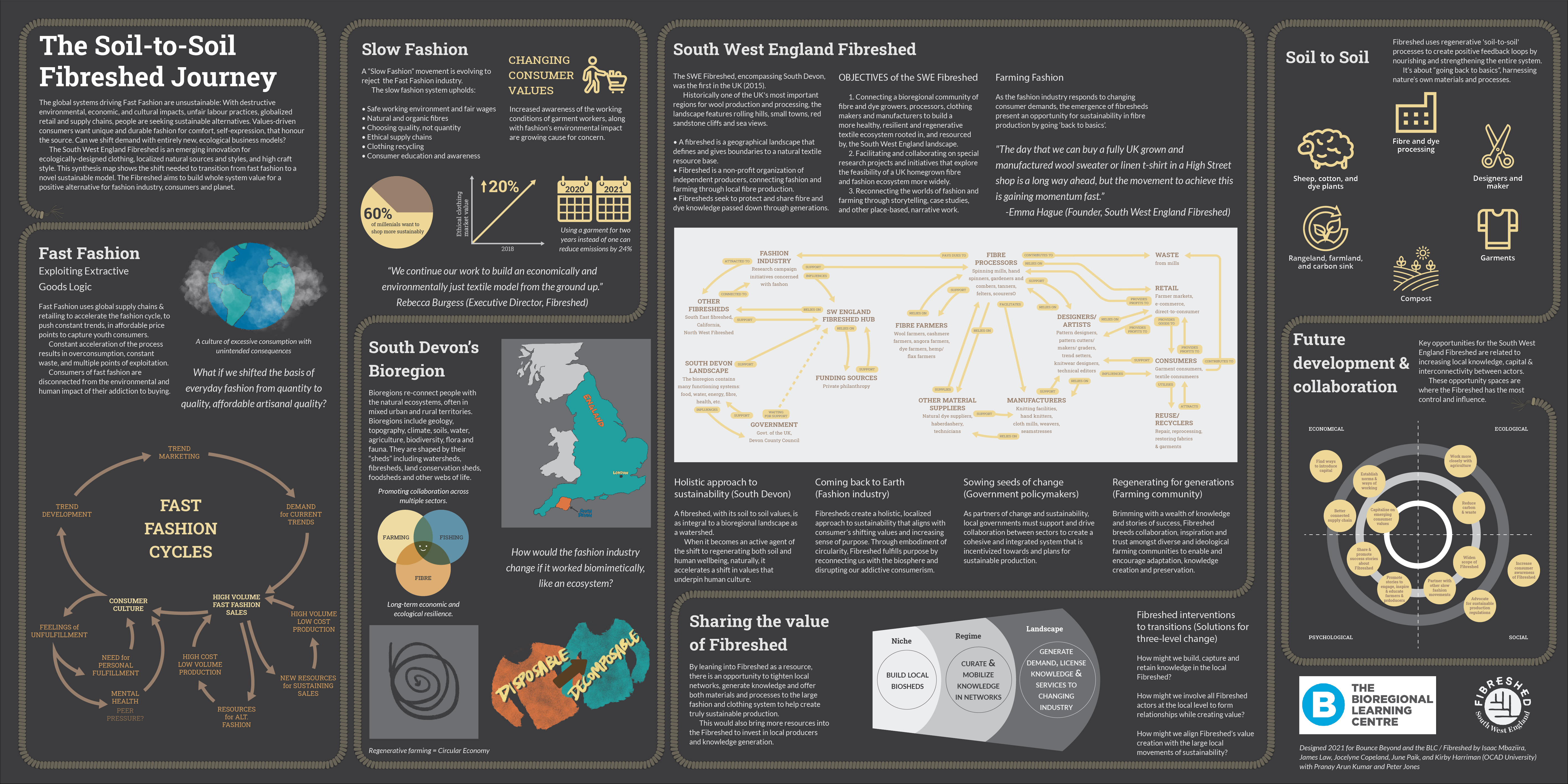 The South West England Fibreshed is an emerging innovation for ecologically-designed clothing, localised natural sources and styles, and high craft style. This synthesis map shows the shift needed to transition from fast fashion to a novel sustainable model. The Fibreshed aims to build a whole system value for a positive alternative for the fashion industry, consumers, and the planet.